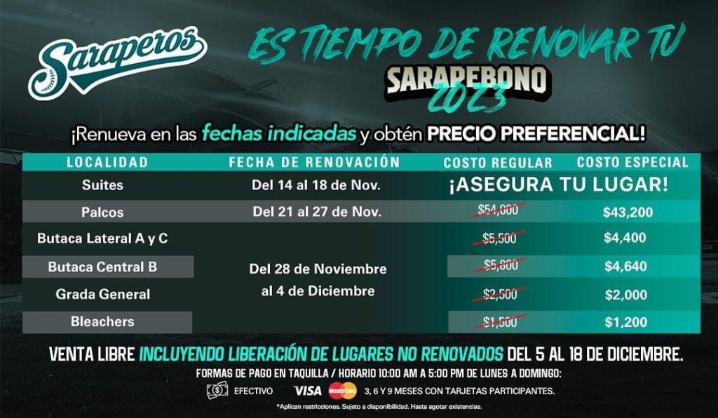 La venta general se llevará a cabo del 5 de diciembre al 18 de ese mismo mes. Las formas de pago son directamente en taquilla con un horario de 10:00 am a 5:00 pm, de lunes a domingo. Se puede pagar con efectivo y tarjetas participantes para disfrutar de esta temporada 2023 que luce prometedora.