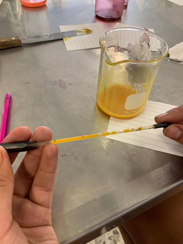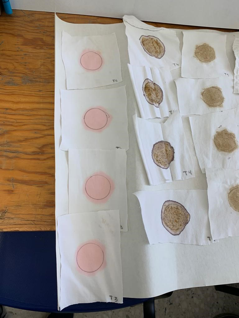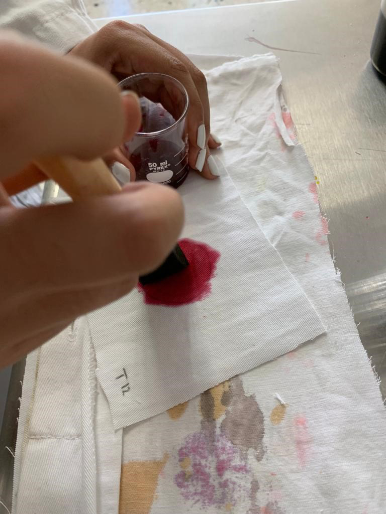 “Para las tintas ecológicas usamos mora negra, nogal, jamaica, cúrcuma y pasta de achiote, realicé pruebas con nuestra tinta, en un repuesto de pluma que vacié y la usé para escritura en papel filtro y de libreta, en el caso de las pruebas textiles luego de aplicarlas, lavarlas y exponerlas al sol durante dos días, los pigmentos de color sobre tela de algodón dieron como resultado colores como amarillo, azul, rosa, café, gris, negro, morado dependiendo de cada ingrediente”, explicó la alumna.