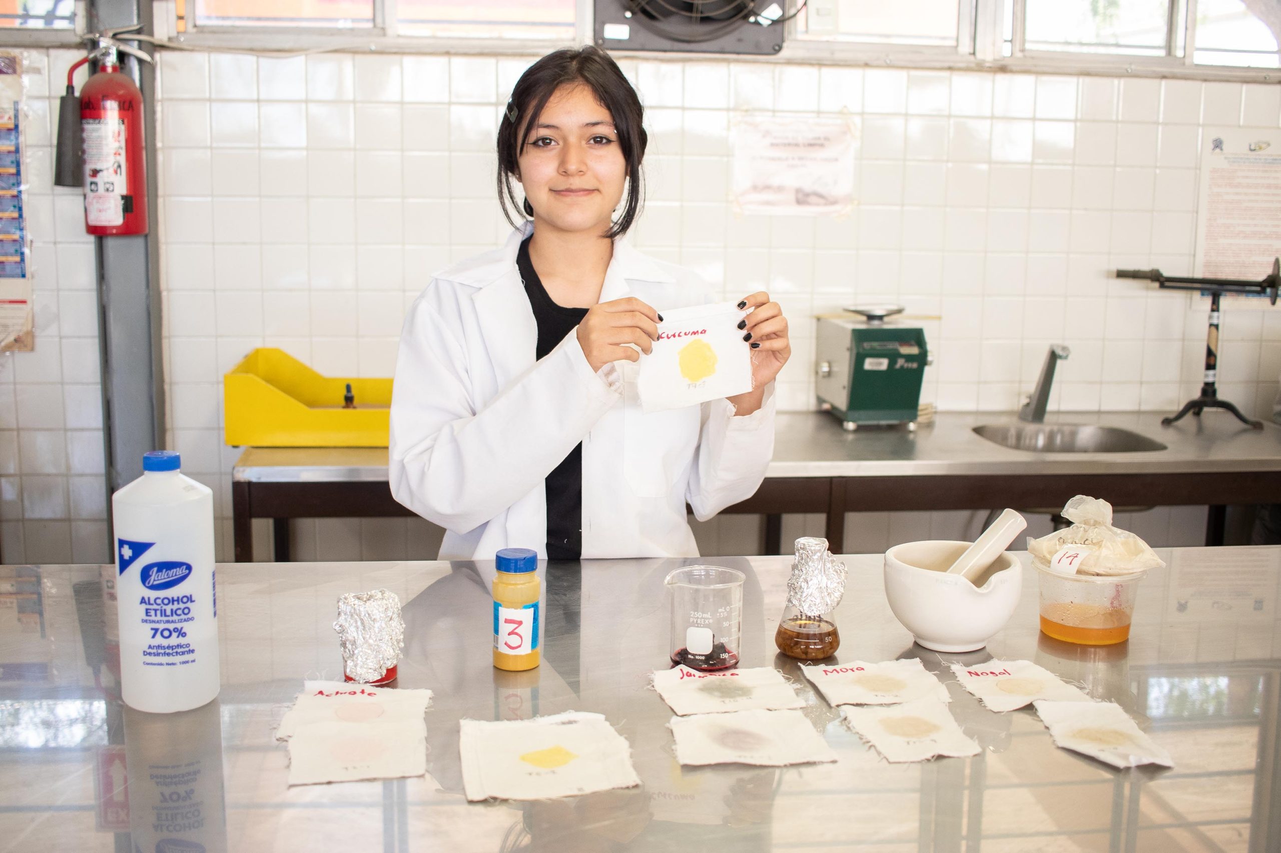 Por lo anterior, Michelle Judith Martínez Zapata, estudiante del tercer semestre, tiene 16 años de edad desarrolló el proyecto “Tintas Ecológicas par Escritura y Teñido de Telas a partir de extractos vegetales”, a raíz de la materia de Química inorgánica que imparte su maestra Rebeca Casique Valdés, la motivó a desarrollar un proyecto que sea noble con el medio ambiente y por un accidente en que a una compañera se le derramó la tinta de su pluma.