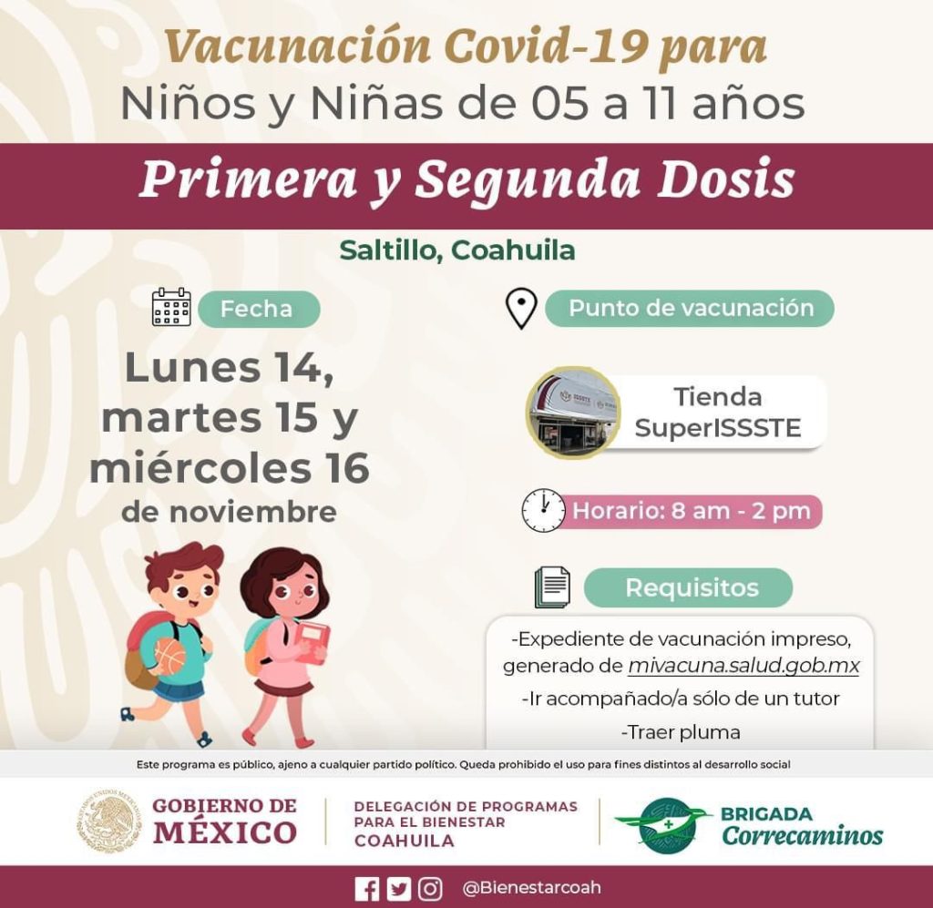 La Delegación de Programas para el Bienestar en Coahuila anunció que los días lunes, martes y miércoles de la semana entrante, se llevará a cabo la aplicación de la vacuna anticovid para las niñas y niños de 5 a 11 años, a quienes se aplicará tanto la primera como la segunda dosis del fármaco de la marca Pfizer.