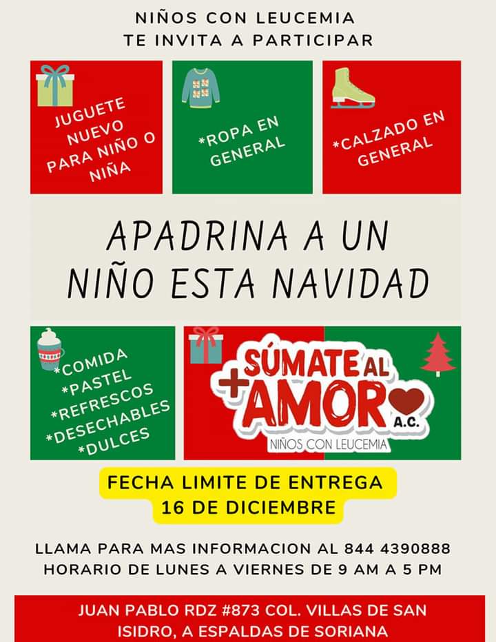 La asociación Niños con Leucemia AC inició la campaña denominada “Apadrina a un niño en esta Navidad” mediante la cual, como ya es tradición cada año, se hace un llamado a los saltillenses para que participen con la entrega de juguetes nuevos y otros obsequios para regalar en esta temporada de fin de año a los menores que son apoyados por esa institución benéfica.