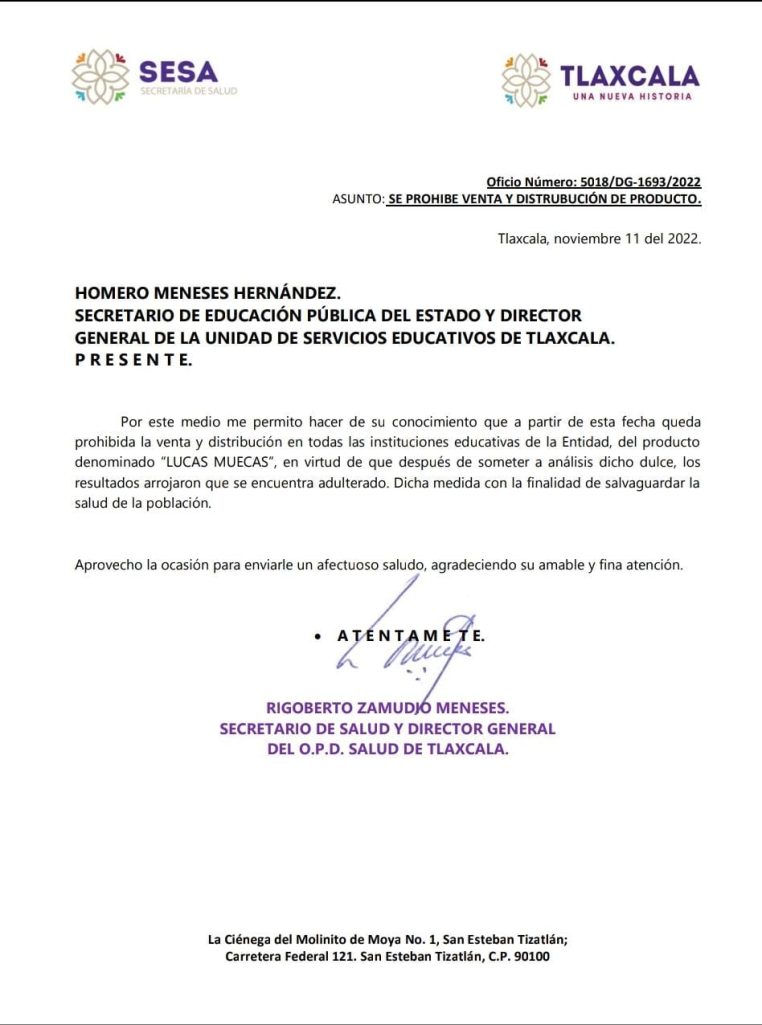 “A partir de esta fecha queda prohibida la venta y distribución en todas las instituciones educativas de la entidad, el producto denominado ‘Lucas Muecas’, en virtud de que después de someter a análisis dicho dulce, los resultados arrojaron que se encuentra adulterado. Dicha medida es con la finalidad de salvaguardar la salud de la población”, refiere el oficio dirigido al secretario de Educación, Homero Meneses Hernández.