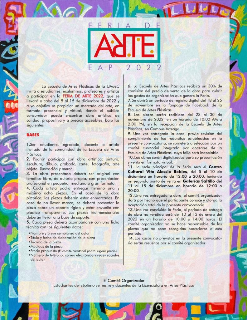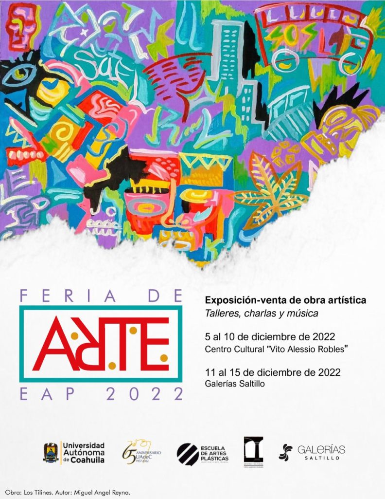La Escuela de Artes Plásticas “Prof. Rubén Herrera” de la Universidad Autónoma de Coahuila, invita a estudiantes, ex alumnos, profesores y artistas a participar en la Feria de Arte EAP 2022, que se llevará a cabo del 5 al 15 de diciembre de 2022 y cuyo objetivo es propiciar un mercado del arte, en formato presencial y virtual, donde el público consumidor pueda encontrar obra artística de calidad, propositiva y a precios accesibles.