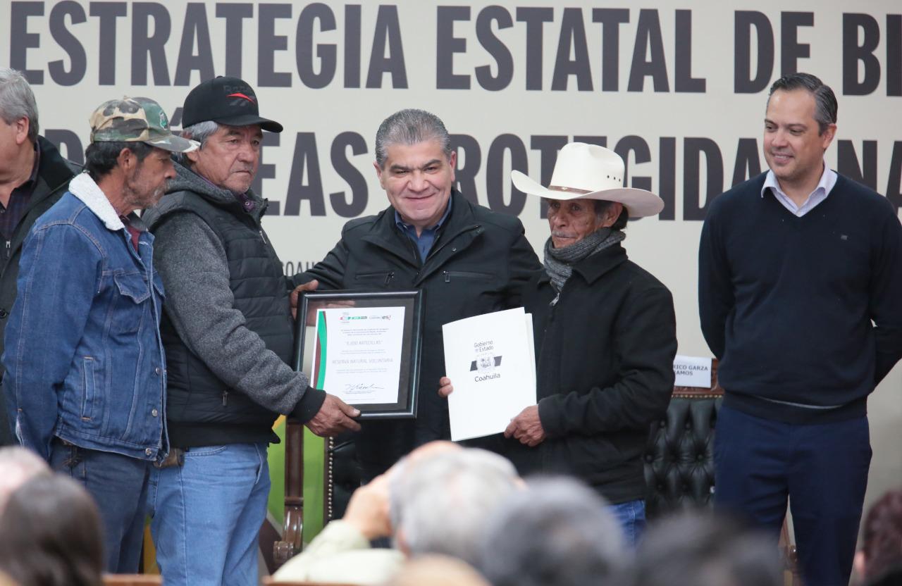 Por otra parte, Miguel Riquelme entregó a familias de pequeños propietarios y ejidatarios de diversos puntos de la entidad, los Decretos que establecen nuevas Reservas Naturales Protegidas Voluntarias de la Entidad, que forman parte de las 13 que se consolidaron en su Administración.