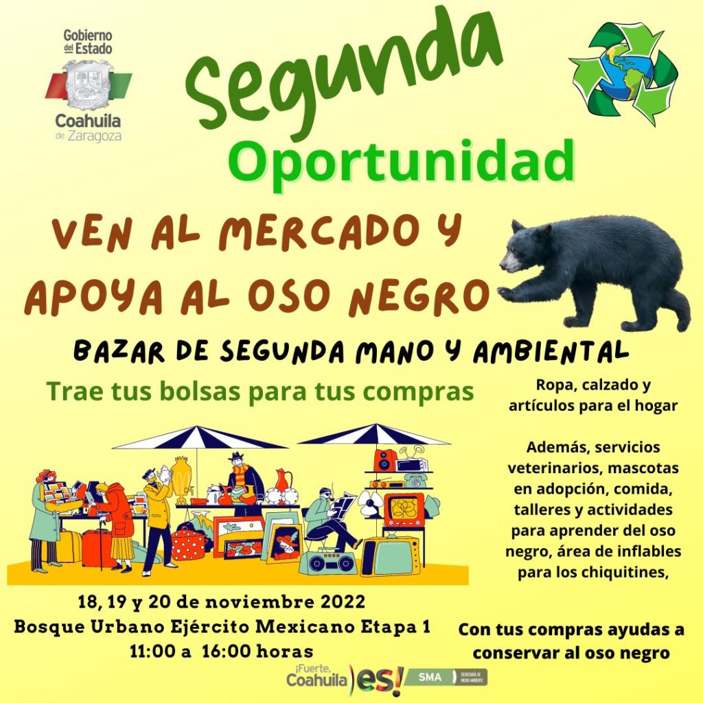 Del 18 al 20 de noviembre de este 2022, en la Etapa 1 del Bosque Urbano Ejército Mexicano, en Saltillo, la Secretaría del Medio Ambiente de Coahuila realizará un bazar para que productores, comerciantes y ciudadanos locales puedan ofrecer productos nuevos o de segunda mano y contribuir con una parte de sus ventas al programa “FONDOSO”, destinado a compensar económicamente a productores del campo y ganaderos por daños o perdida de sus cultivos o animales por la presencia del oso negro.