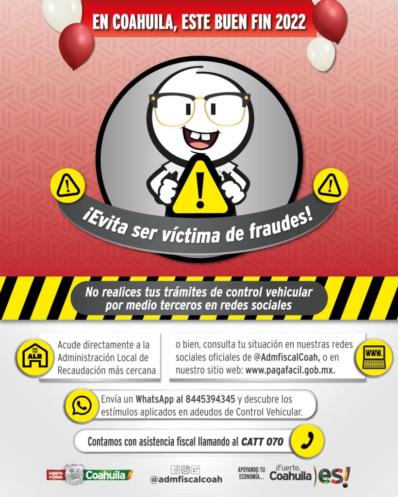 La Administración Fiscal General del Estado (AFG) invita a los contribuyentes coahuilenses a que utilicen los medios oficiales para realizar sus trámites durante este Buen Fin 2022.