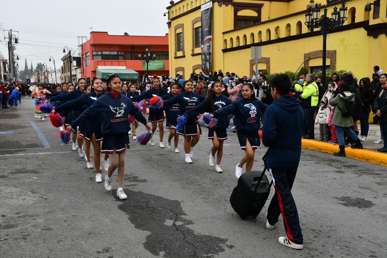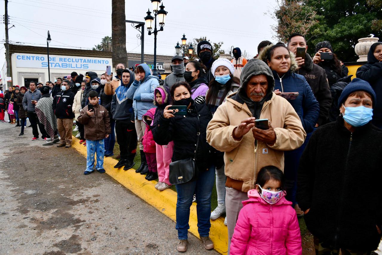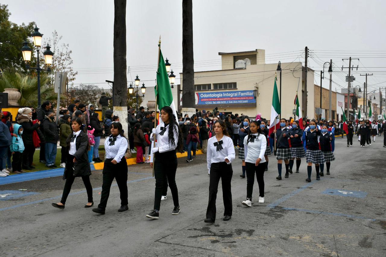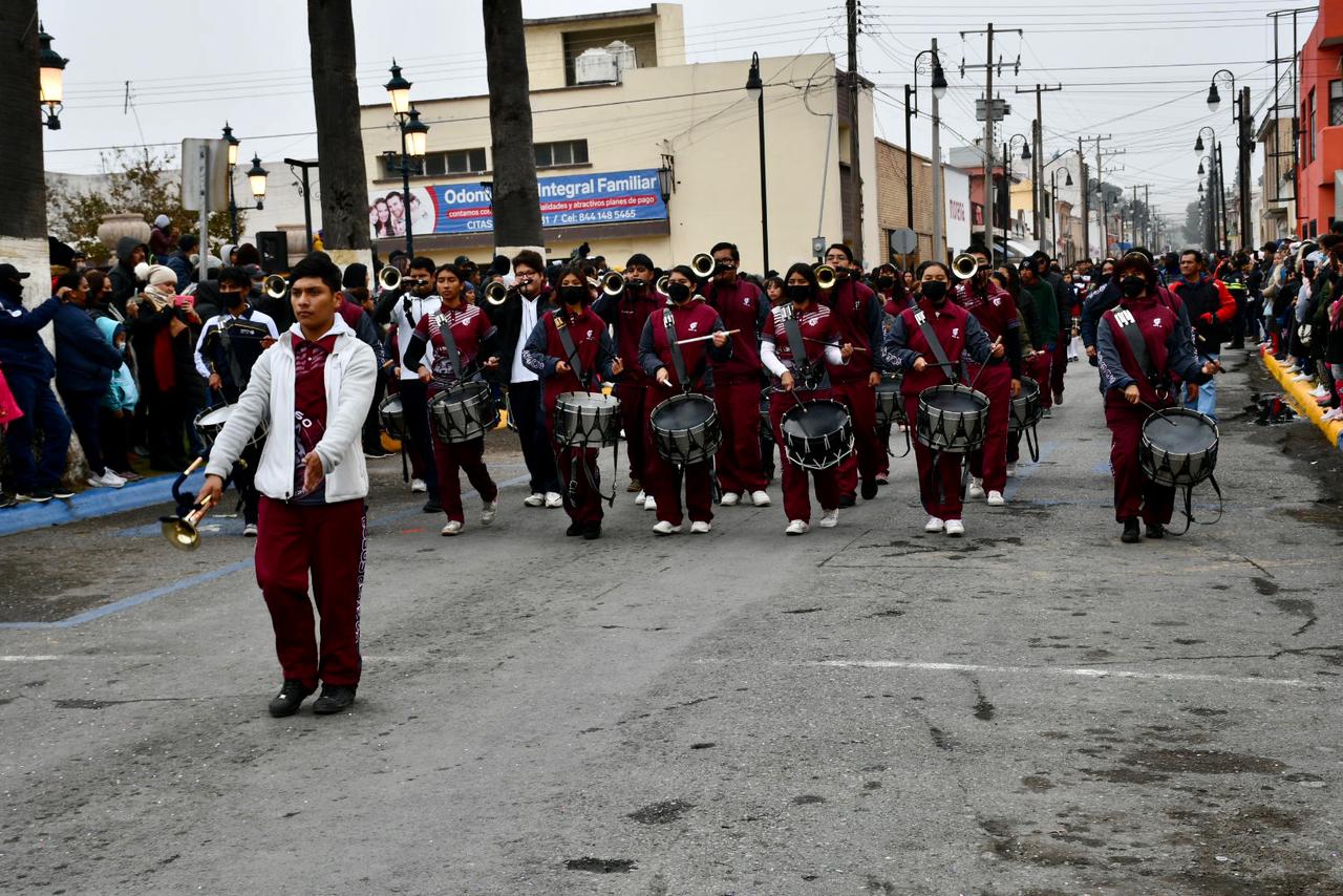Durante el desfile, las familias de los alumnos presenciaron la actividad a pesar de las bajas temperaturas que se han registrado debido a la llegada del frente frío número 10 en la Región Sureste de Coahuila.