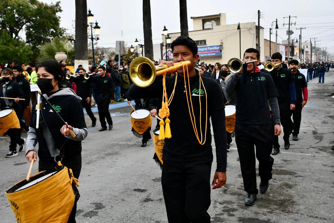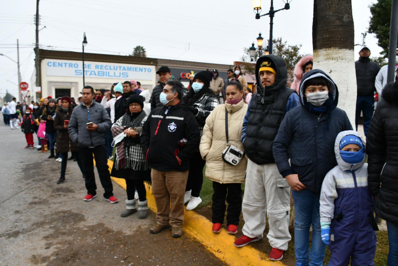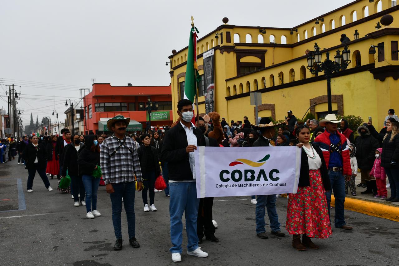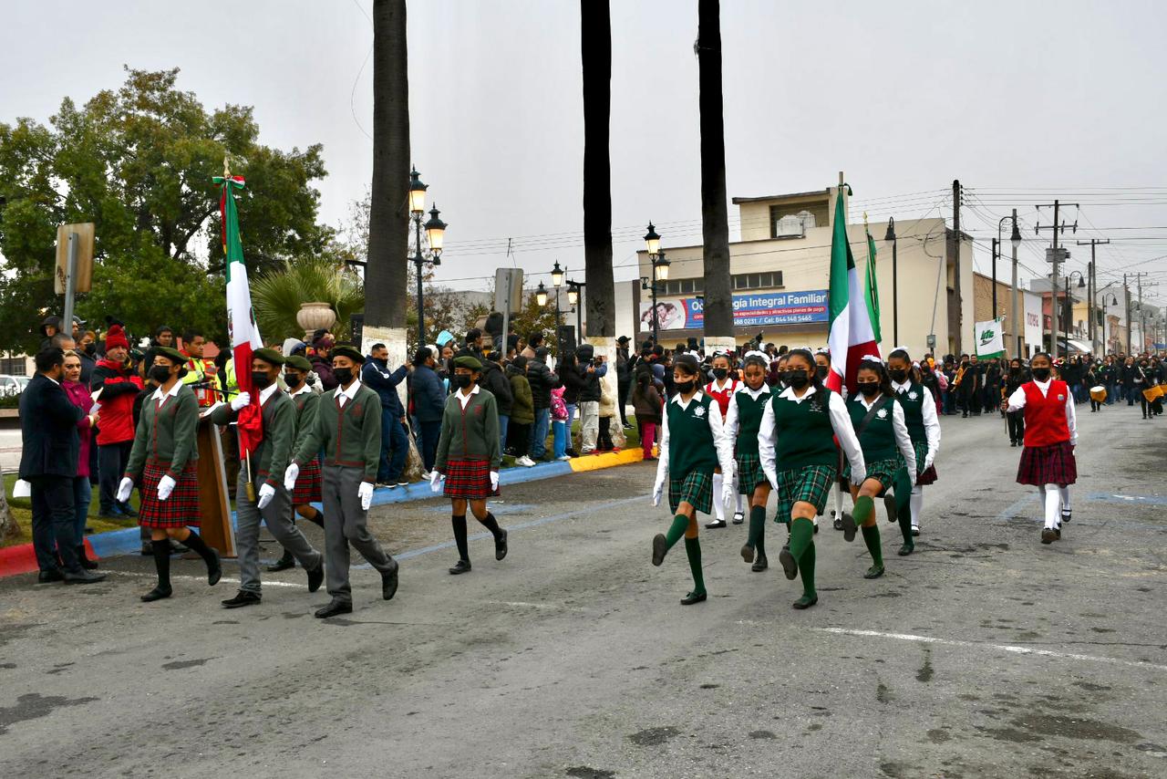 Durante el desfile, las familias de los alumnos presenciaron la actividad a pesar de las bajas temperaturas que se han registrado debido a la llegada del frente frío número 10 en la Región Sureste de Coahuila.