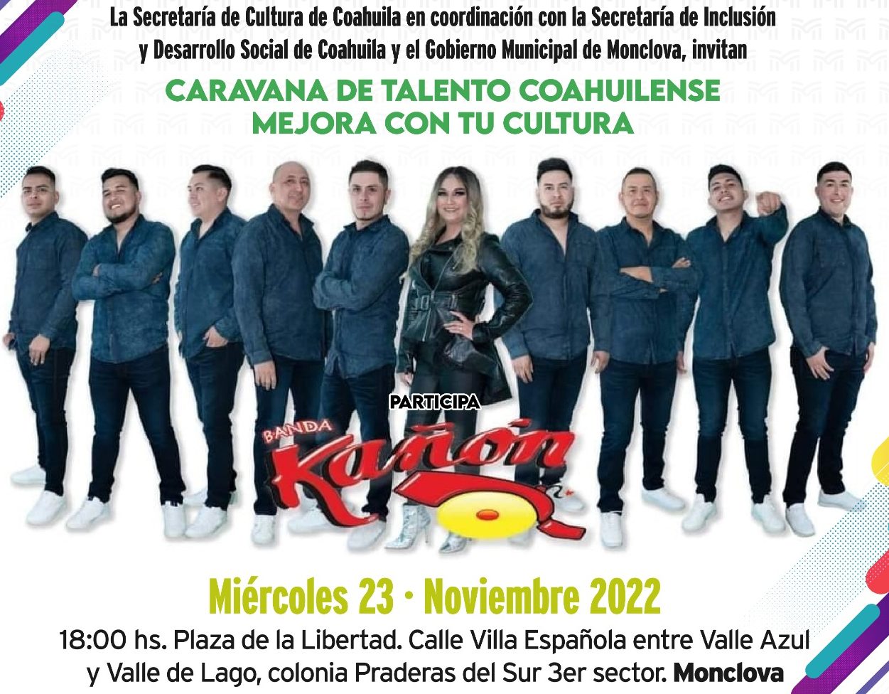 Para el miércoles 23 de noviembre, se estará presentando en Monclova en la Plaza de la Libertad, ubicada en calle Villa Española, entre calles Valle Azul y Valle de Lago, Colonia Praderas del Sur 3er Sector, a partir de la 16:00 horas, en las que iniciará con el taller de arte “Godet”, con Elena Alonso. Posteriormente se tendrá la participación de la cuentacuentos “Supera Tovar”, para continuar a las 17:00 horas con el Grupo de Danza Folklórica Yestli y el grupo Fiesta Americana; a las 18:00 horas hará presencia el grupo musical Fesati y se tendrá un gran cierre con la presentación de Banda Kañón, que pondrá a bailar a los asistentes.