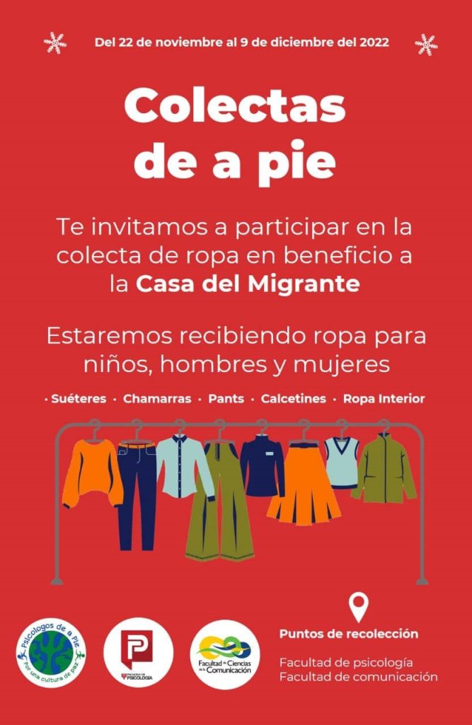 La Facultad de Psicología y la Facultad de Ciencias de la Comunicación de la Universidad Autónoma de Coahuila, en conjunto con la organización comunitaria Psicólogos de a Pie, invitan a la comunidad universitaria y público en general a sumarse a “Colectas de a pie” en apoyo a la Casa del Migrante de Saltillo.