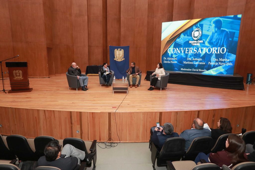 Posteriormente se llevó a cabo el conversatorio “Presente y futuro de la Investigación en la UA de C”, fungiendo como moderador el periodista David Brondo y como panelistas el Dr. Alejandro Dávila Flores, Dra. Antonia Martínez Luévanos y la Dra. Martha Patricia Nava Hernández, durante el cual hablaron sobre el trabajo de investigación y los programas de posgrado en la máxima casa de estudios.