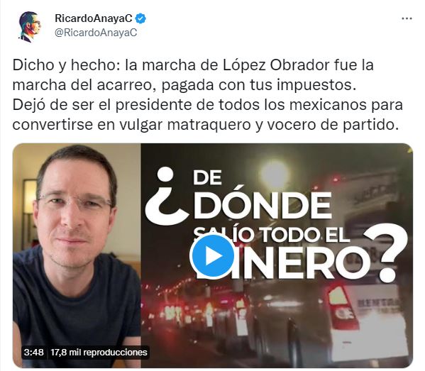 Dejó de ser el presidente de todos los mexicanos para convertirse en vulgar matraquero y vocero de partido. pic.twitter.com/AlNEVTewXb— RicardoAnayaC (@RicardoAnayaC) November 28, 2022