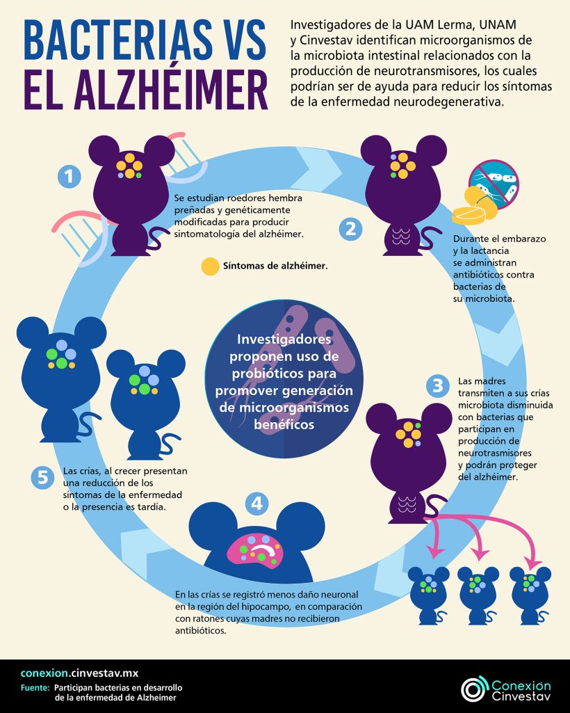 “Sabemos que la microbiota de la madre tiene influencia en la salud de las crías a través de la leche materna; de ese modo, el uso de antibióticos durante la lactancia también influye en las bacterias transferidas. Con ese antecedente, el experimento buscó identificar los cambios en el tránsito de la enfermedad de las crías cuando se disminuye la microbiota de la madre, incluyendo bacterias que, por alguna razón, podrían estar relacionadas con el alzhéimer, como es el caso de aquellas con lipopolisacáridos en su estructura”, señaló Corona Cervantes.