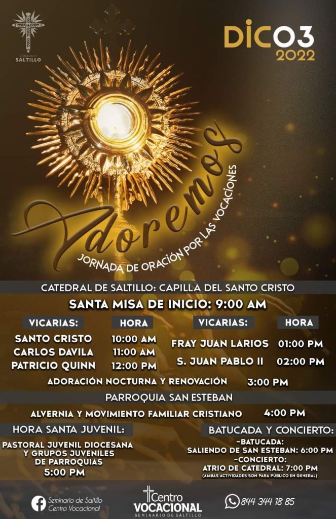 El próximo sábado 3 de diciembre de este 2022, el Seminario de Saltillo realizará una jornada de oración denominada “Adoremos”, con la que se pedirá a Dios por el aumento de la vocación sacerdotal en la capital coahuilense.