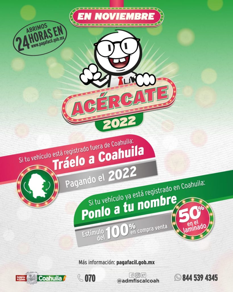 Díaz González agregó: “Y si tu vehículo está registrado fuera del estado, con el programa ‘Tráelo a Coahuila’, pagando sólo el Ejercicio Fiscal 2022 se condona al 100 por ciento de ejercicios anteriores”.