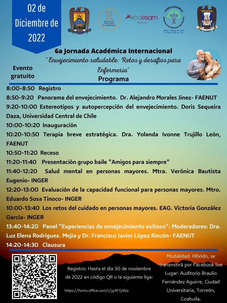 Torreón, Coahuila. La Facultad de Enfermería Unidad Torreón (FAENUT) de la Universidad Autónoma de Coahuila, a través de su Cuerpo Académico Enfermería Geronto Geriátrica, en conjunto con el Instituto Nacional de Geriatría y la Red Internacional de Enfermería en Salud del Adulto Mayor, invitan a la comunidad universitaria, profesionales de la salud y público en general a participar en la Sexta Jornada Académica Internacional “Envejecimiento saludable: Retos y desafíos para Enfermería”, la cual forma parte de la Cuarta Semana Académica y que se llevará a cabo el viernes 2 de diciembre de 8:00 a 14:30 horas en modalidad híbrida.