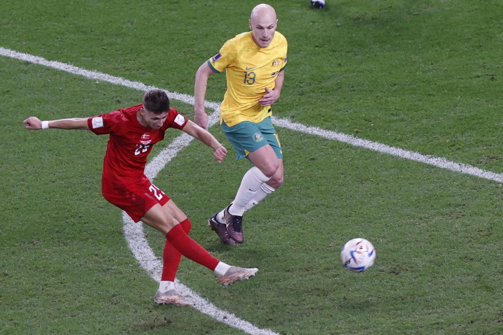 Apremiados por la necesidad, los daneses se lanzaron al ataque; y en el undécimo minuto, Ryan se lució ante Mathias Jensen; tres minutos antes de que a Andreas Skov Olsen lanzase por encima de la meta de los ‘socceroos’; y que diez después ambos combinasen en un pared que este último no pudo culminar más que con un flojo disparo a las manos del portero oceánico.