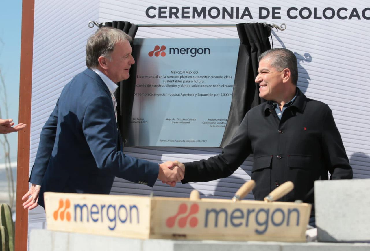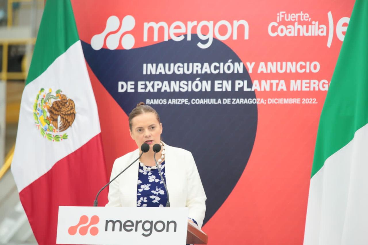 La empresa Mergón es de capital irlandés e invierte 15 millones de dólares en su planta de Ramos Arizpe, la primera en México, y que se especializa en la fabricación de componentes para la industria automotriz; en esta primera fase generará alrededor de 150 empleos directos.