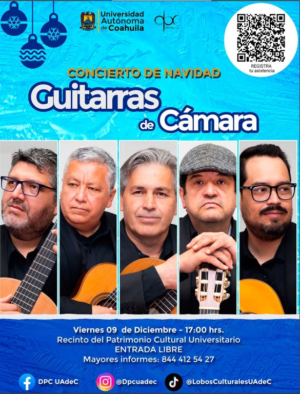 Para el viernes 9 de diciembre, a las 17:00 horas se presentará el Concierto Navideño a cargo del Grupo de Guitarras de Cámara de la UA de C, en el Recinto Cultural Universitario; la entrada será libre, para mayores informes comunicarse al (844) 412 54 27; el sábado 10 de diciembre a las 12:00 horas, el Ciclo de Arte y Ciencia presenta la Conferencia de Thomas Merton, en el Recinto Cultural Universitario Aurora Morales de López.