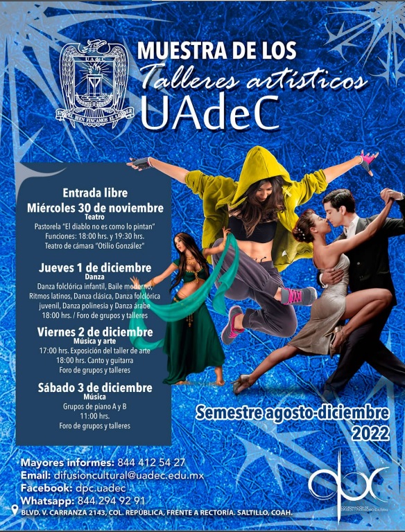 Continuarán las actividades el jueves 1 de diciembre, a las 18:00 horas con la Muestra de los Talleres Artísticos de Danza de la UA de C con la presentación Danza Folclórica Infantil, Baile moderno, Ritmos latinos, Danza clásica, Danza folclórica juvenil, Danza polinesia, y Danza árabe, en el Foro de Grupos y Talleres, ubicado en Bulevar Venustiano Carranza #2143, Col. República, frente al edificio de Rectoría.