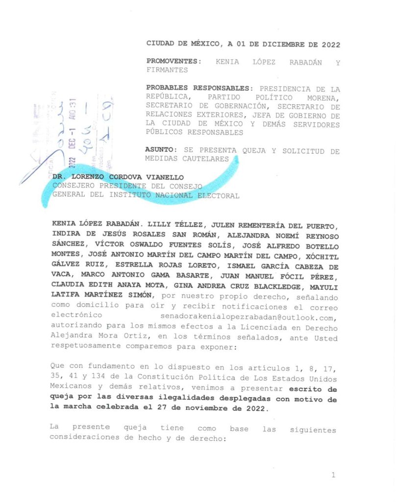 Tal y como lo había anunciado en su conferencia “La Contramañanera”, la legisladora panista presentó ante el Instituto Nacional Electoral (INE), escrito de queja por las ilegalidades realizadas antes y durante la marcha del domingo pasado.