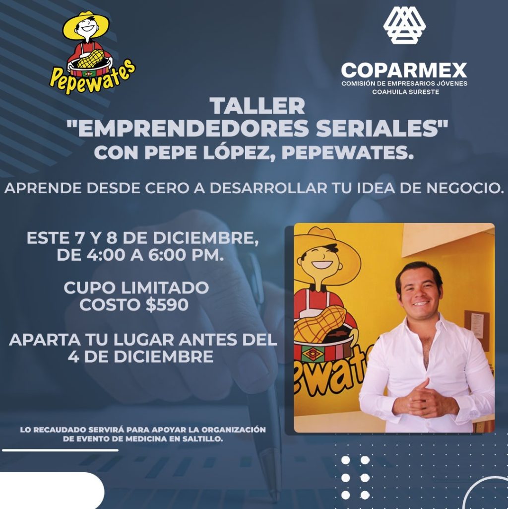 Con el propósito de que emprendedores potenciales puedan desarrollar su idea de negocio desde cero para convertirla en una realidad, los próximos 7 y 8 de diciembre de este 2022, de 4:00 a 6:00 de la tarde, la Comisión de Empresarios Jóvenes de la Confederación Patronal de la República Mexicana (Coparmex) Coahuila Sureste ofrecerá un taller denominado “Emprendedores Seriales”.
