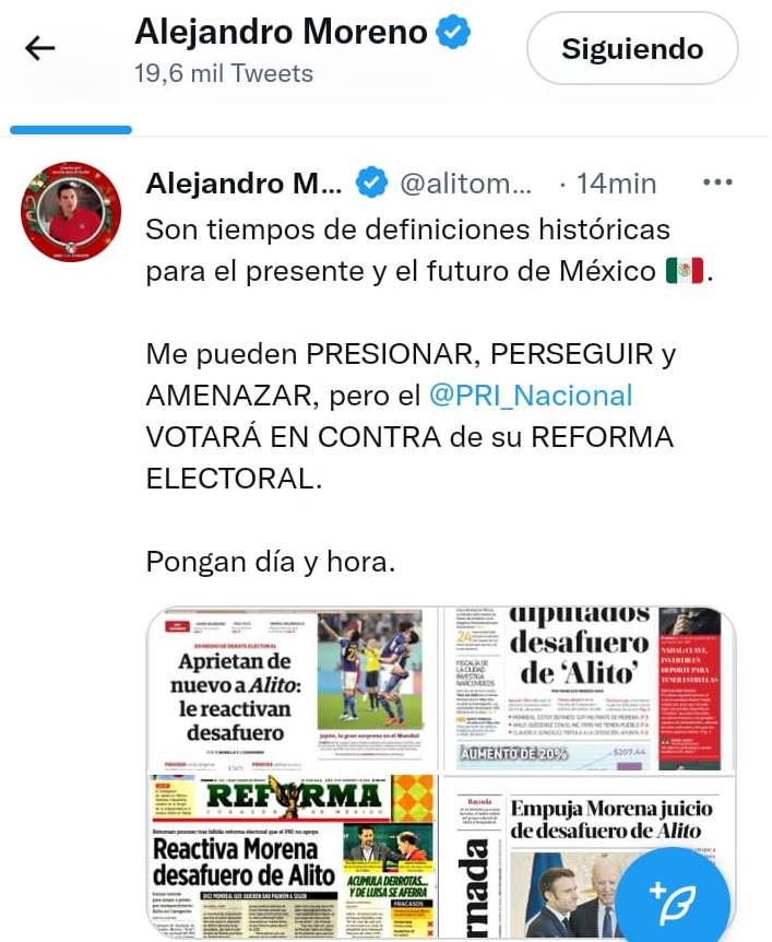 Ciudad de México.- “Me pueden presionar, perseguir y amenazar, pero el Partido Revolucionario Institucional (PRI) votará en contra de su reforma electoral”, expresó, tajante, el Presidente Nacional del tricolor, Alejandro Moreno, en respuesta a las presiones del gobierno de Morena, para que los legisladores federales priistas aprueben su iniciativa, con la que pretenden dañar al Instituto Nacional Electoral (INE) y al Tribunal Electoral del Poder Judicial de la Federación (TEPJF).