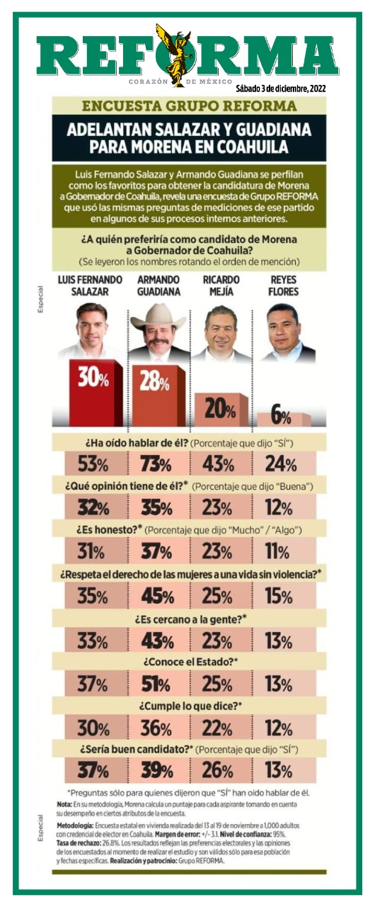 El periódico Reforma elaboró en Coahuila una encuesta igualita a la que Morena debe estar levantando ya para definir al que será su candidato a la gubernatura de nuestro estado, y los resultados obtenidos confirman lo que todo mundo ya sabemos: que, si la encuesta de Morena se lleva a cabo como debe de ser, sin trampas ni simulaciones, entonces ARMANDO GUADIANA será sin duda alguna el que se quede con la nominación.