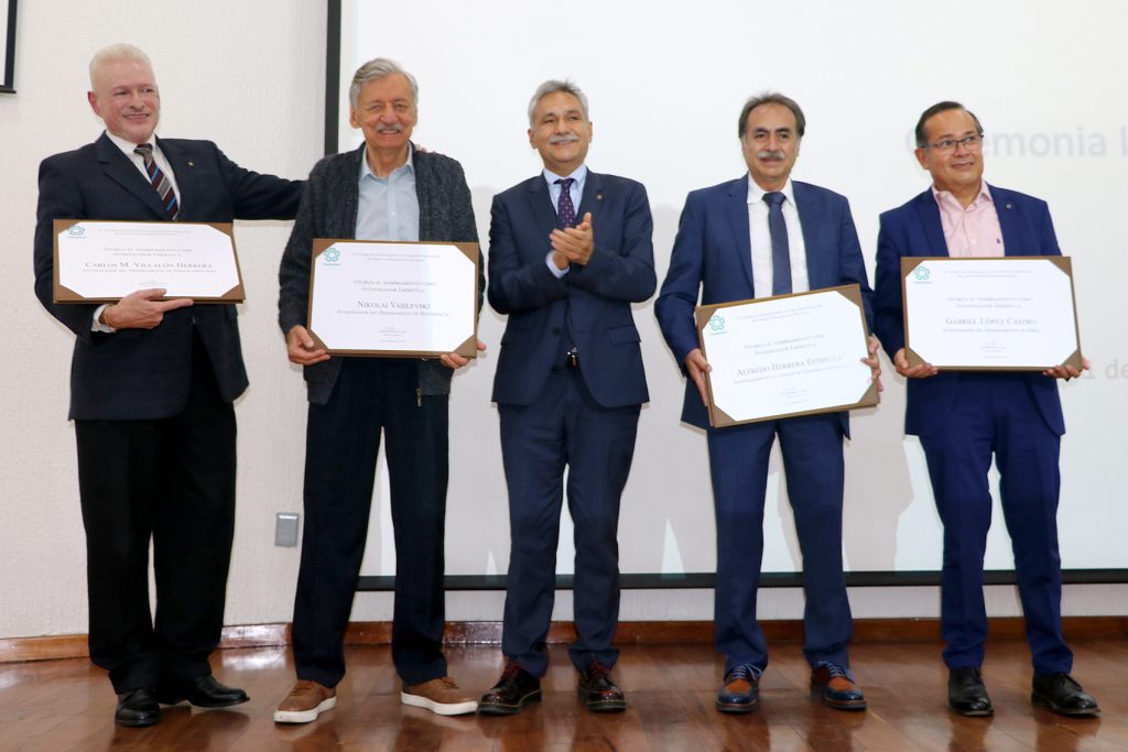 Ciudad de México.- En una ceremonia realizada en el Auditorio Arturo Rosenblueth se reconoció la trayectoria de Alfredo Herrera Estrella, quien ha contribuido a descifrar genomas completos de diversas plantas; de Gabriel López Castro, dedicado a la física teórica de altas energías; de Nikolai Vasilevski, especialista en álgebra conmutativa y de Carlos Villalón Herrera, enfocado en la farmacología cardiovascular.