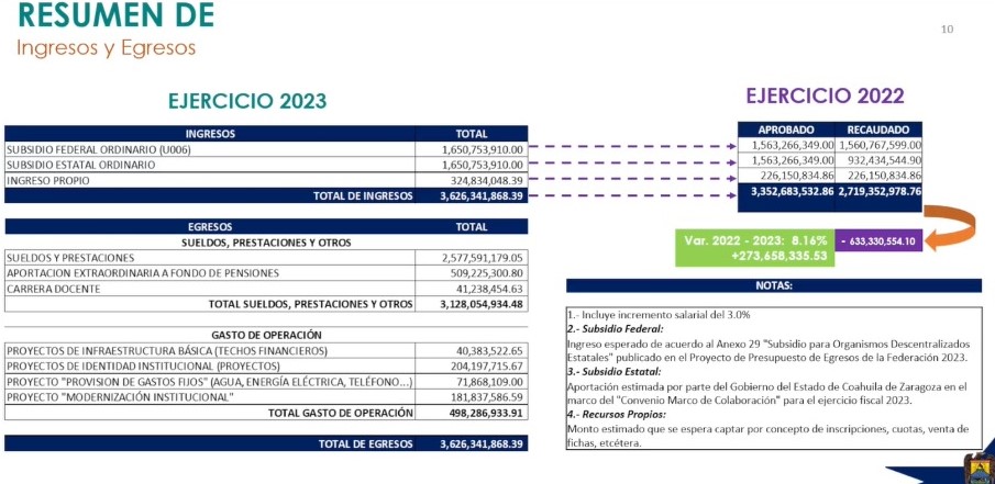 Señaló que, el ejercicio de egresos 2023, de igual manera serán los 3 mil 626 millones 341 mil 868.39 pesos y estará destinado principalmente para sueldos y prestaciones, aportación extraordinaria al fondo de pensiones, carrera docente, proyectos de infraestructura básica, proyectos de identidad institucional, provisión de gastos fijos (agua, luz, teléfono) y proyectos de modernización institucional.