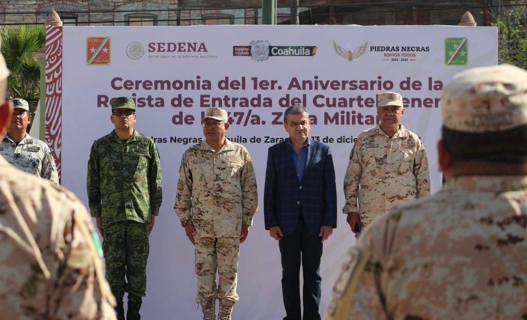 El Mandatario estatal acompañó al Comandante de la 11 Región Militar, general Eufemio Alberto Ibarra Flores; al Comandante de la 47ª Zona Militar, general José Fausto Torres Sánchez; y al Comandante del 26º Regimiento de Caballería Motorizado, coronel Julio César Guadarrama Reza, así como la Alcaldesa de Piedras Negras, Norma Treviño Galindo.