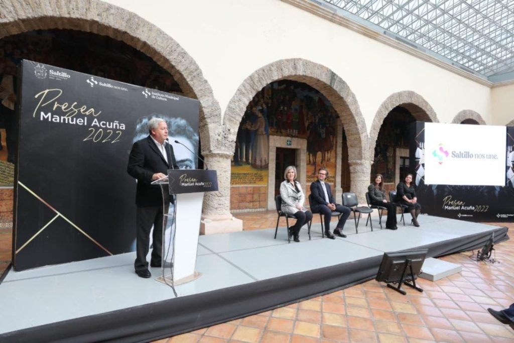 De las manos del alcalde José María Fraustro Siller, Natanael Espinoza Rincón, director de la Orquesta Filarmónica del Desierto, fue galardonado con la presea Manuel Acuña, el máximo reconocimiento cultural que otorga el Gobierno Municipal de Saltillo.