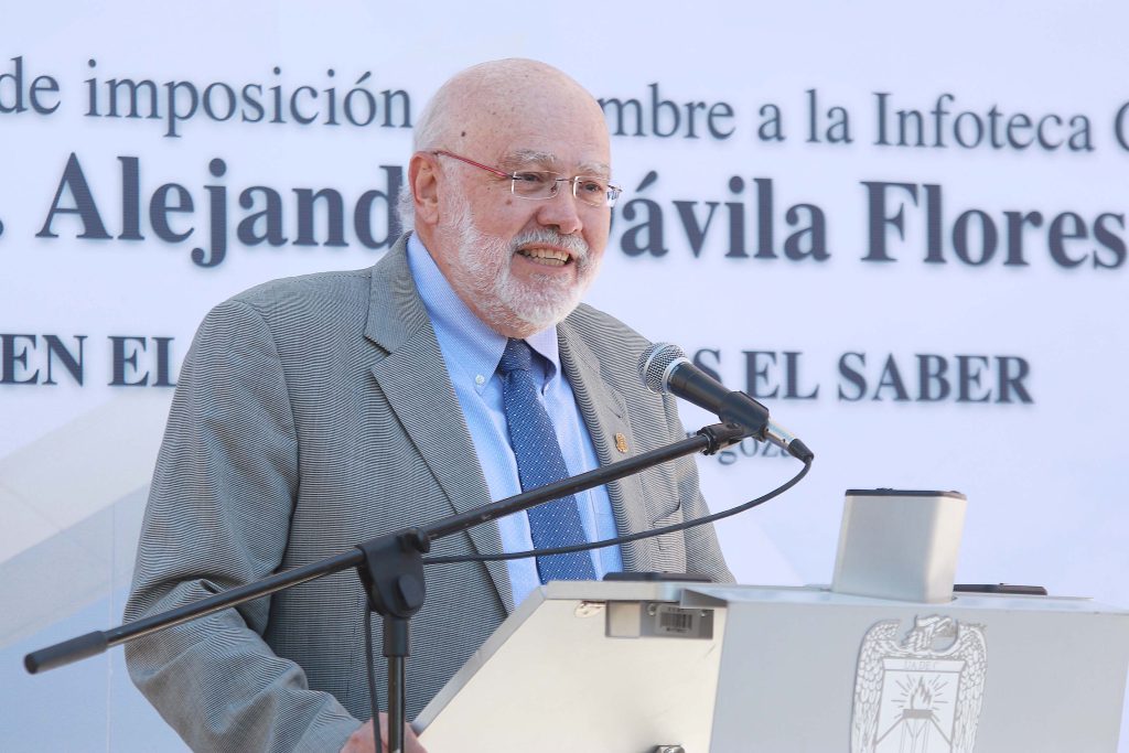 Durante el evento se llevó a cabo la develación de la placa con la que se impone el nombre de “Dr. Alejandro Dávila Flores” a la Infoteca Central ubicada en Unidad Camporredondo, por su visión de dotar de espacios dignos para la consulta de material bibliográfico y el estudio de las y los universitarios, así como por su destacada trayectoria en el desarrollo y consolidación de la investigación en ciencia económica y regional. (EL HERALDO)