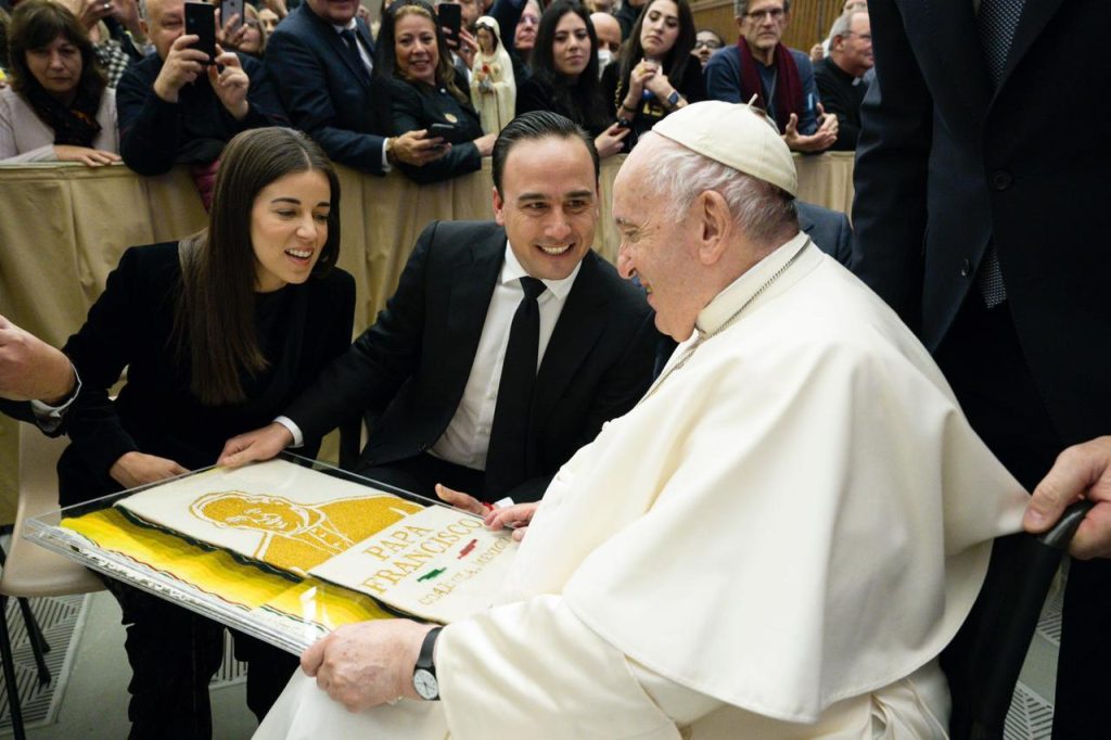 Roma, Italia.- Como parte de una delegación de mexicanos que acudió al Vaticano, este miércoles Manolo Jiménez Salinas y su esposa Paola Rodríguez López fueron recibidos en audiencia por S.S. el Papa Francisco, a quien le obsequiaron un tradicional sarape elaborado por artesanos Coahuilenses con su nombre e imagen bordados.