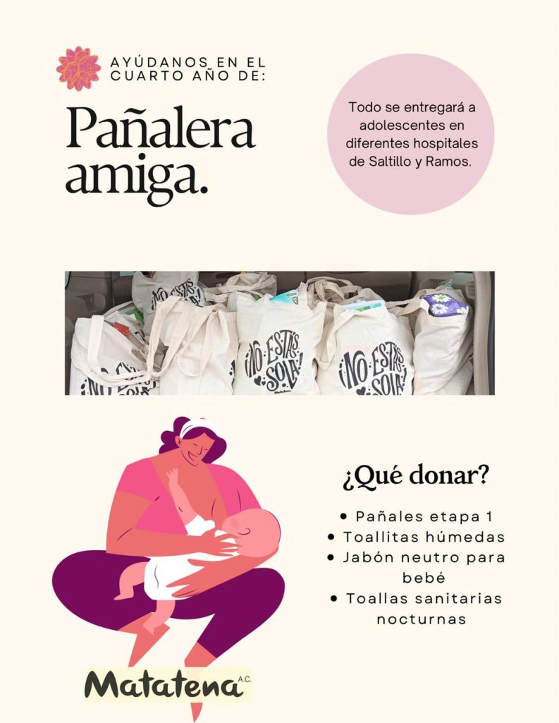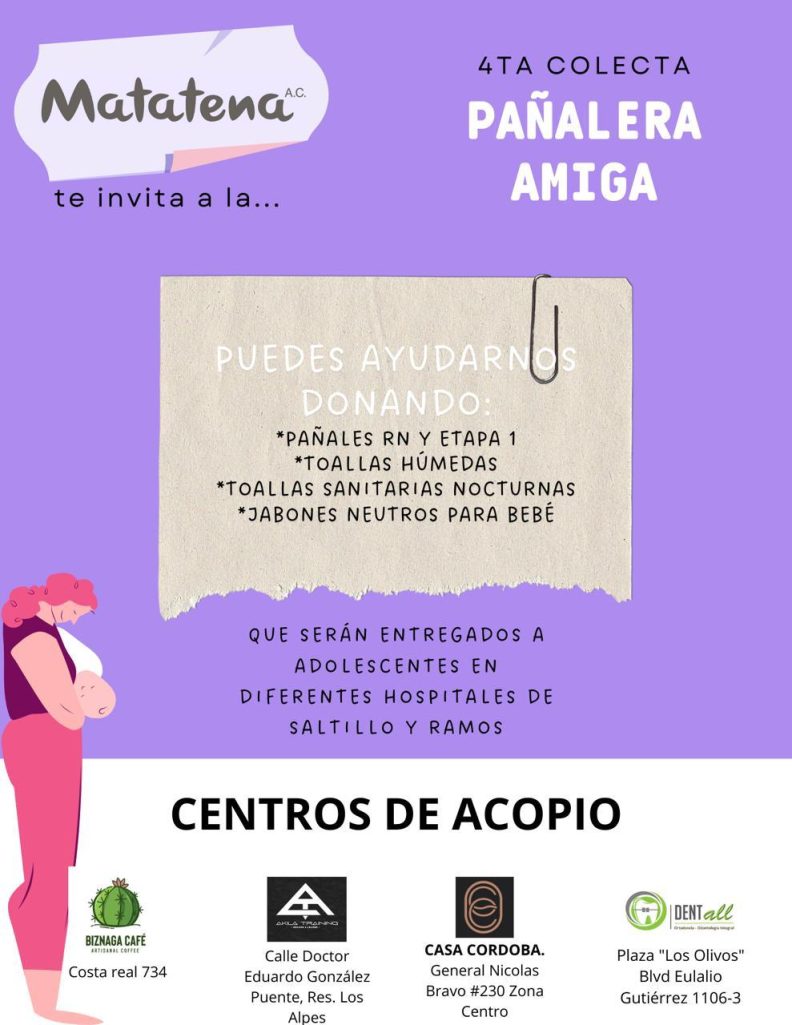 La asociación civil “Matatena” invita a la ciudadanía a sumarse a su cuarta colecta “Pañalera Amiga”, con la que reunirá pañales para recién nacido y etapa uno, toallas húmedas y sanitarias, además de jabones neutros para bebé.
