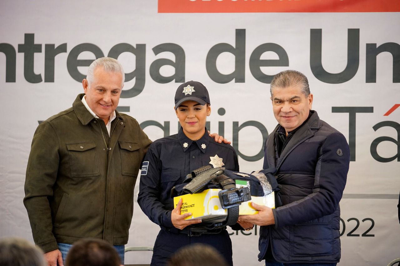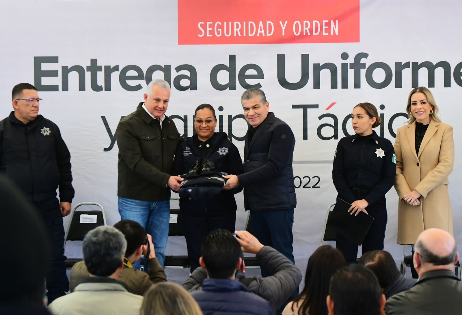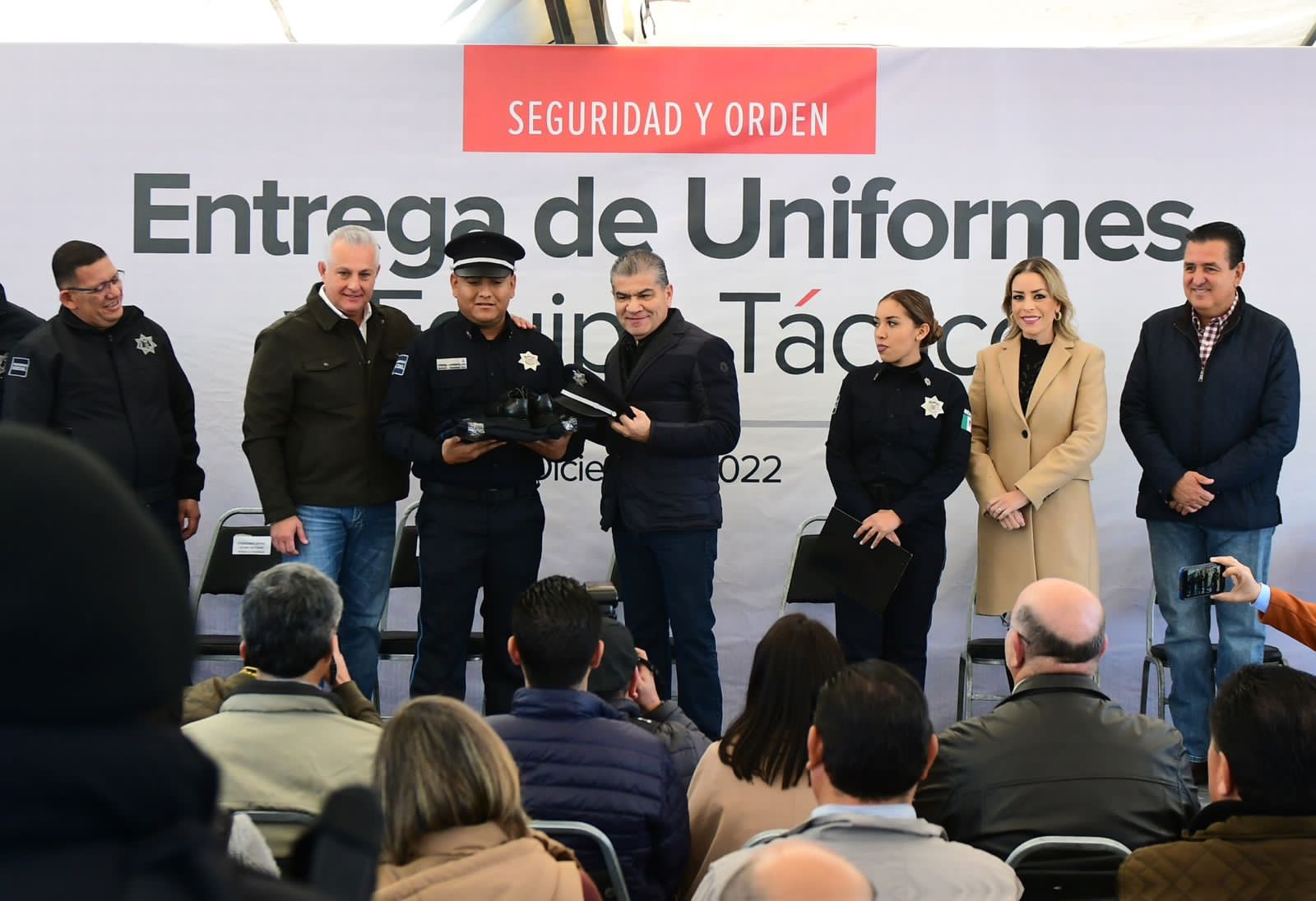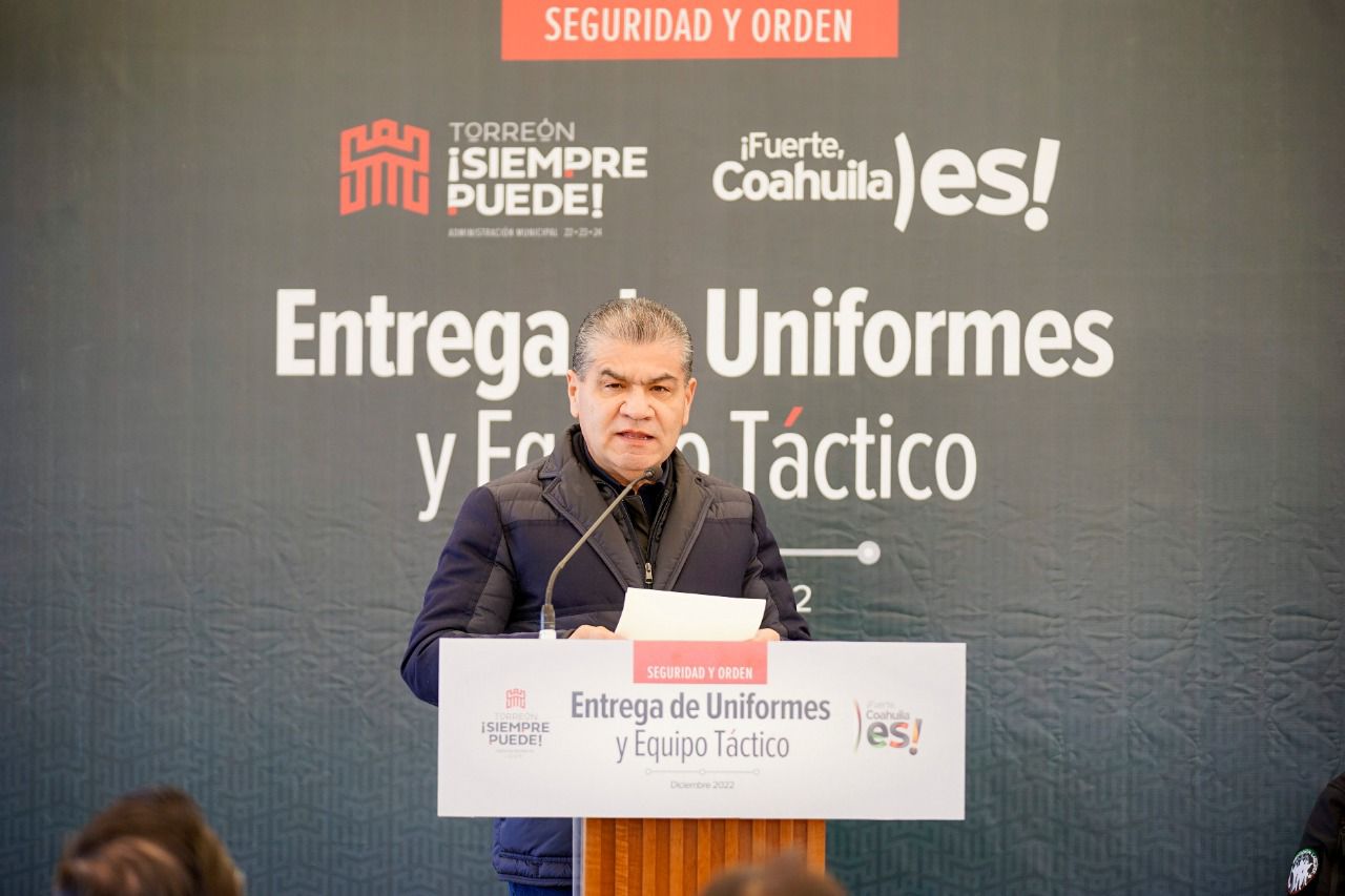 Torreón, Coah.- Como parte del reforzamiento de las acciones para mantener la paz y la seguridad en el estado, el gobernador Miguel Ángel Riquelme Solís entregó uniformes y equipo táctico a los elementos de la Dirección Municipal de Seguridad Pública (DSPM) de Torreón, con una inversión de 15 millones de pesos.