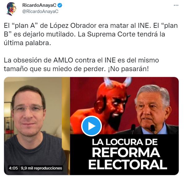 “Si el plan A, la reforma constitucional, buscaba dejar muerto y enterrado al INE, el plan B que aprobaron busca dejar al INE sin brazos y sin piernas. O sea, el plan A era de plano matar al INE. El plan B es dejarlo todo mutilado”, insistió.