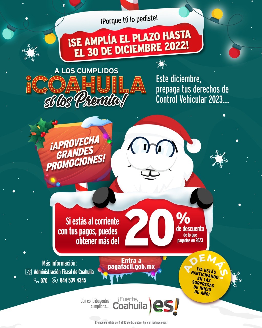 Javier Díaz González, Administrador Fiscal de Coahuila, informó que se prolonga el programa y los beneficios de “A los cumplidos Coahuila sí los premia” con el Prepago 2023, hasta el día viernes 30 de diciembre del 2022.