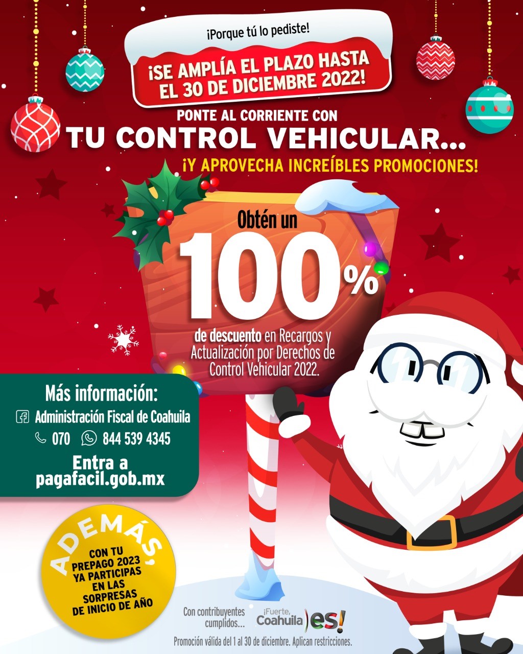 “Si tienes un adeudo y quieres ponerte al corriente, tienes hasta el 30 de diciembre para aprovechar un 100% de descuento en recargos y actualización por derechos de control vehicular 2022, de tal manera que puedas realizar tu Prepago 2023 y disfrutar de un gran descuento”.
