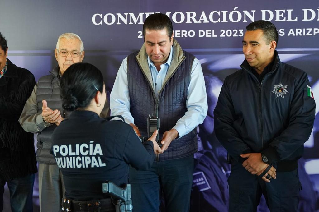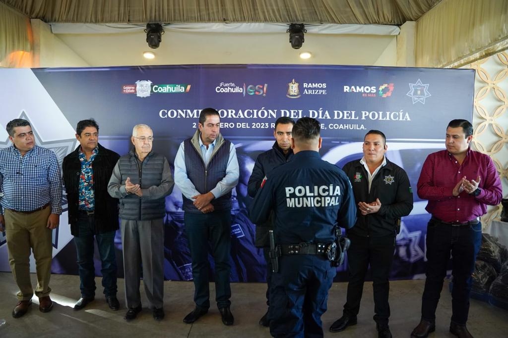 Con la entrega de equipo de comunicación, chalecos balísticos y uniformes, con un valor cercano a los 5 millones de pesos, el alcalde Chema Morales festejó el “Día del Policía” junto a los integrantes de la corporación municipal en Ramos Arizpe.