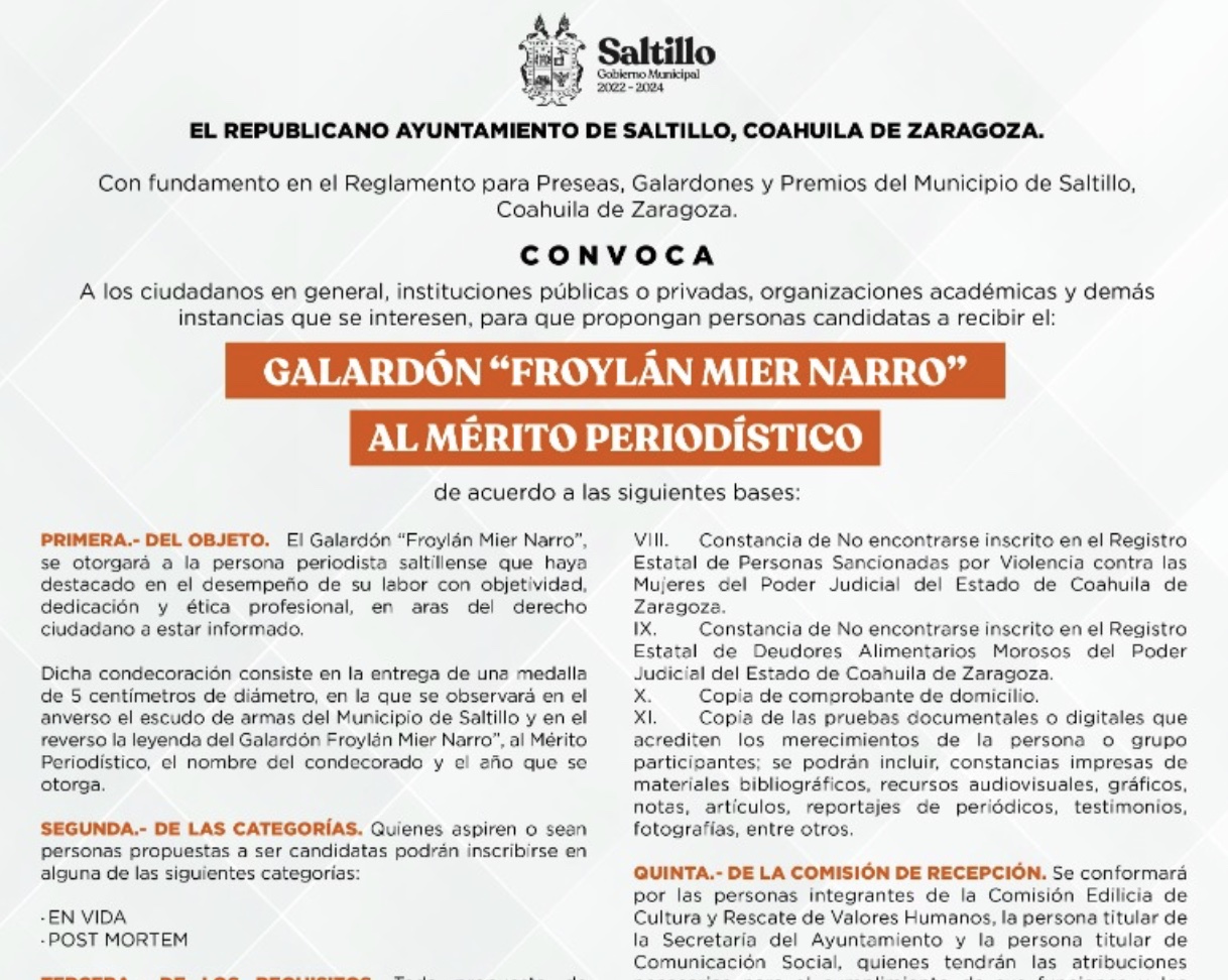 El Republicano Ayuntamiento de Saltillo lanzó la convocatoria para otorgar el Galardón Froylán Mier Narro al Mérito Periodístico en sus dos categorías: En Vida y Post Mortem, por lo que invitó a los interesados para que ingresen sus postulaciones.