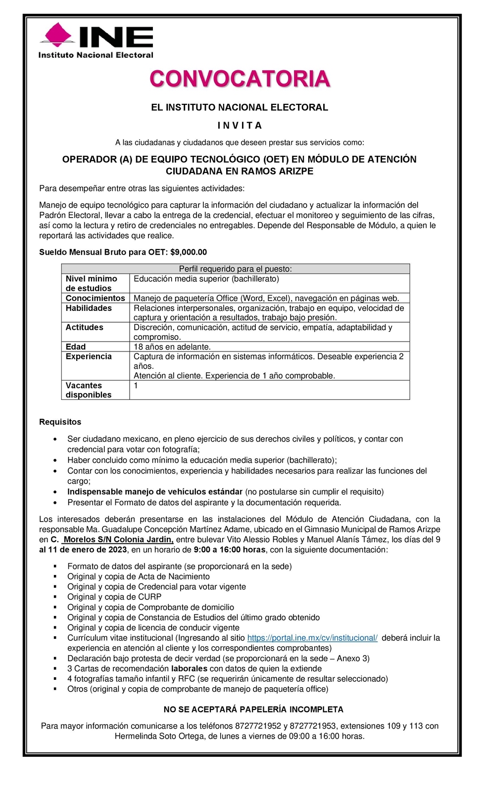 El Instituto Nacional Electoral (INE) con sede en Ramos Arizpe, convoca a las ciudadanas y ciudadanos que deseen prestar sus servicios como Operador de Equipo Tecnológico (OET) en el módulo de atención ciudadana ubicado en el gimnasio municipal “Eulalio Gutiérrez”, dio a conocer Sagrario Blanco Farias, vocal del Registro Federal de Electores.