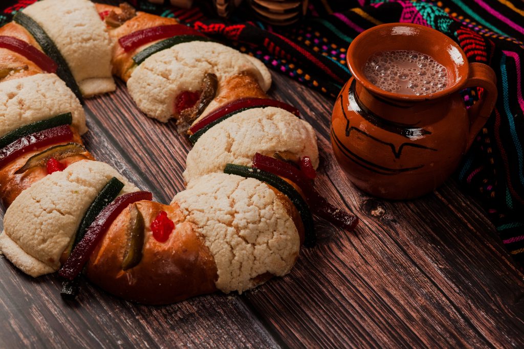 De igual manera, la rosca de reyes es un pastel redondo y dulce que se hornea con pasas, nueces y frutas confitadas.