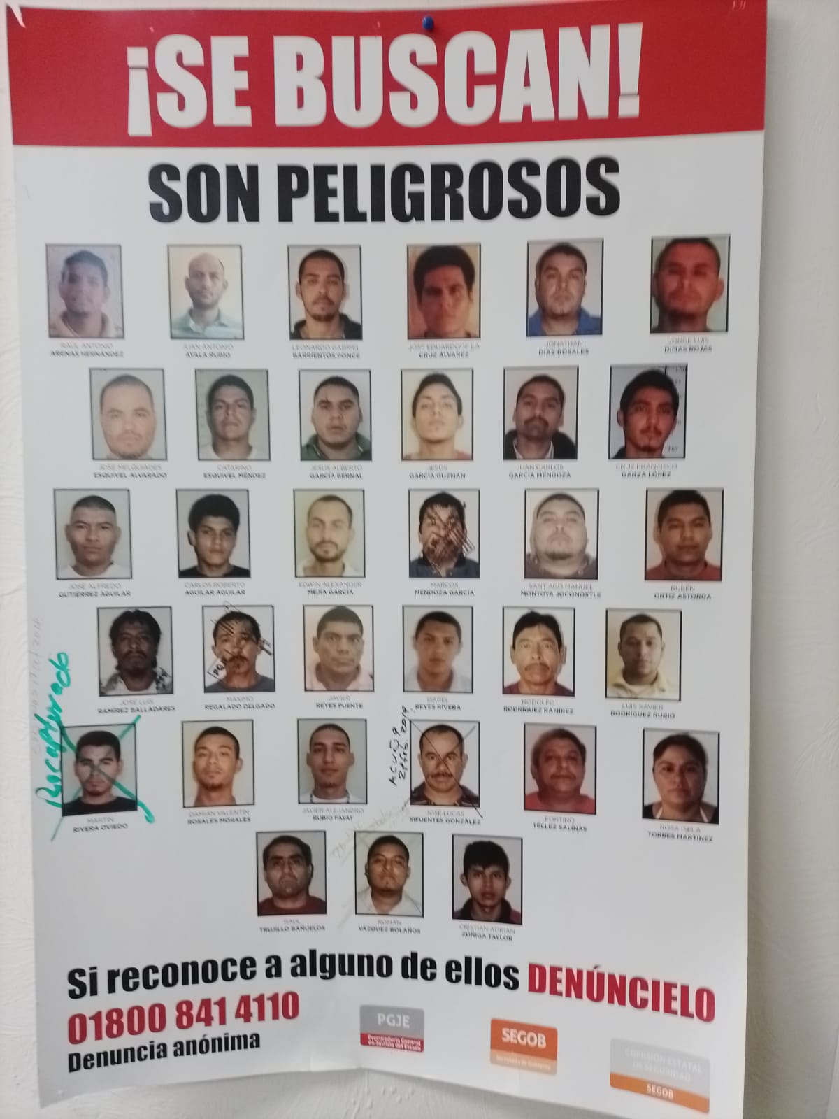 La dependencia de procuración de justicia señala en sus carteles: “Se Buscan Son Peligrosos” y aparece la fotografía, nombres, y en algunos casos, los apodos de los reos que continúan fugitivos. “Si reconoce a algunos de ellos Denúncielos 01800 8414110, denuncia anónima”.