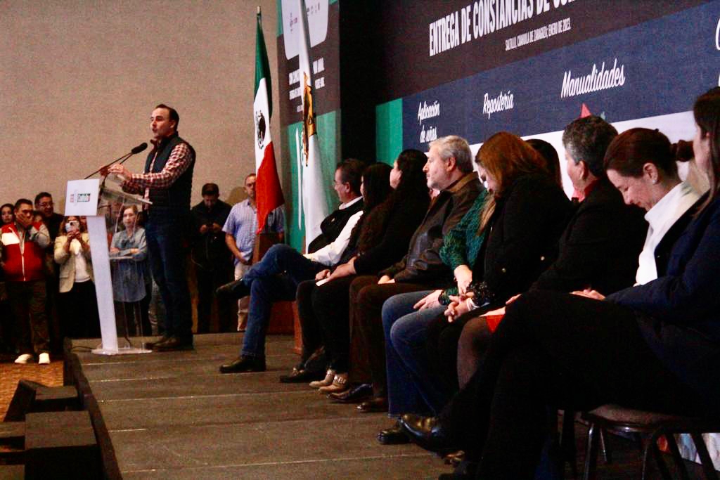 El Secretario de Inclusión y Desarrollo Social del Estado, Manolo Jiménez Salinas; la Secretaria del Trabajo, Nazira Zogbi Castro, y el Alcalde de Saltillo, José María Fraustro Siller, entregaron las 500 constancias a las personas que acreditaron alguno de los cursos que ofreció la SIDS y la ST de capacitación en manualidades, aplicación de uñas, corte de cabello y repostería del ICATEC.