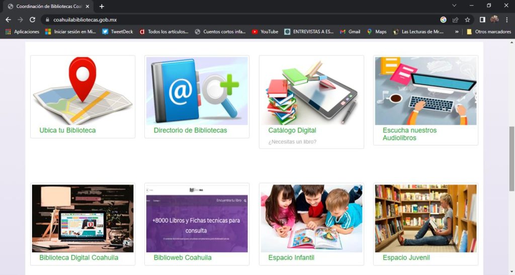 “Ubica tu biblioteca, directorio de bibliotecas, catálogo digital, audiolibros y más”, invitó Gustavo Cantú Castañeda, Coordinador General de Bibliotecas, Publicaciones y Librerías del Estado, a la población a visitar la página de internet https://www.coahuilabibliotecas.gob.mx/, en donde se encuentra contenido lúdico, educativo y cultural para chicos y grandes.