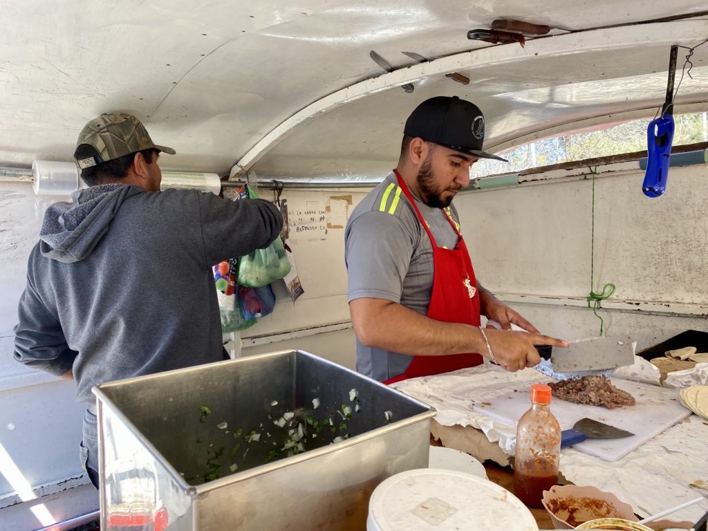 La camioneta cuenta con su área de plancha donde se cocina la carne, el área donde se pica la barbacoa y donde preparan y ponen en bolsas la verdura que se acompaña con el taco, así como las distintas salsas para servir a los comensales, de lunes a domingo a partir de las 9:00 horas.