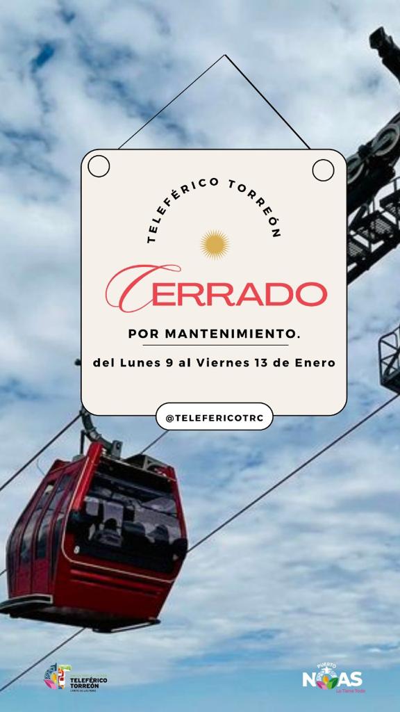 Torreón, Coahuila.- El Teleférico de Torreón y el Puerto Noas permanecerán cerrados por mantenimiento del lunes 9 al viernes 13 de enero.
