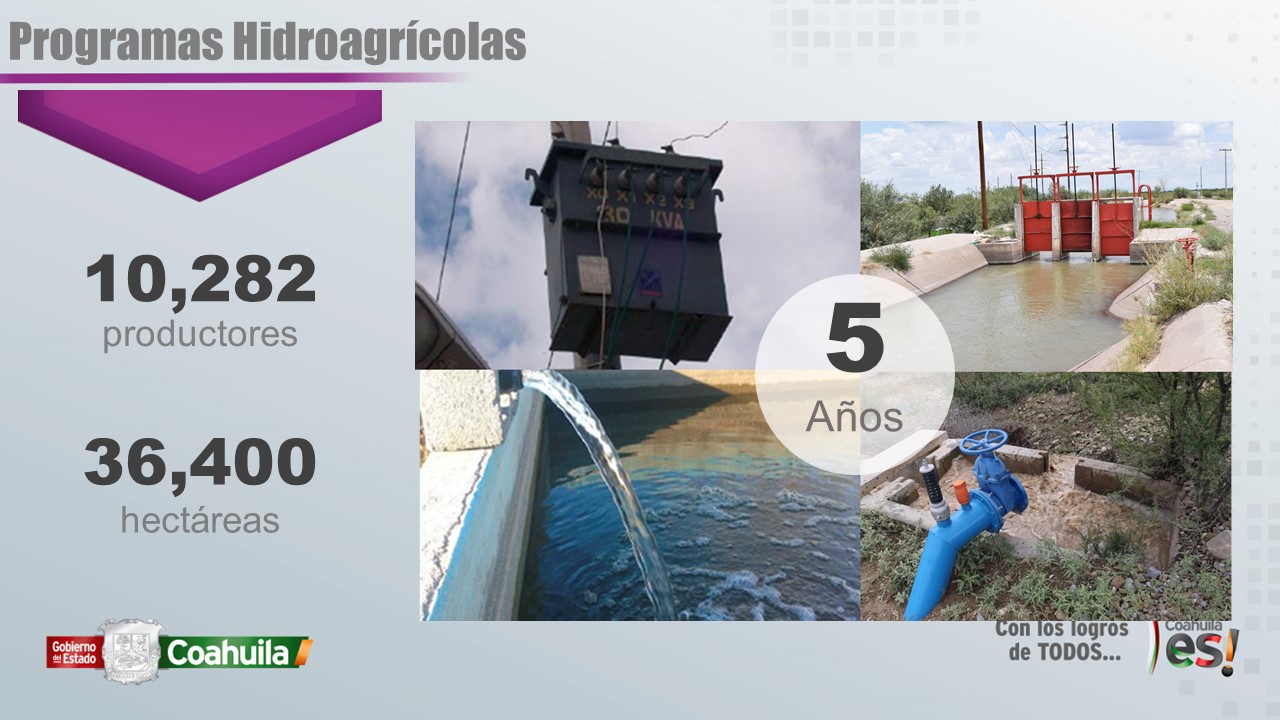 En coordinación con la Comisión Nacional del Agua (CONAGUA), la Administración de Miguel Ángel Riquelme Solís trabajó en la rehabilitación, modernización, tecnificación y equipamiento de Unidades y Distritos de Riego, en beneficio de 10 mil 282 productores.