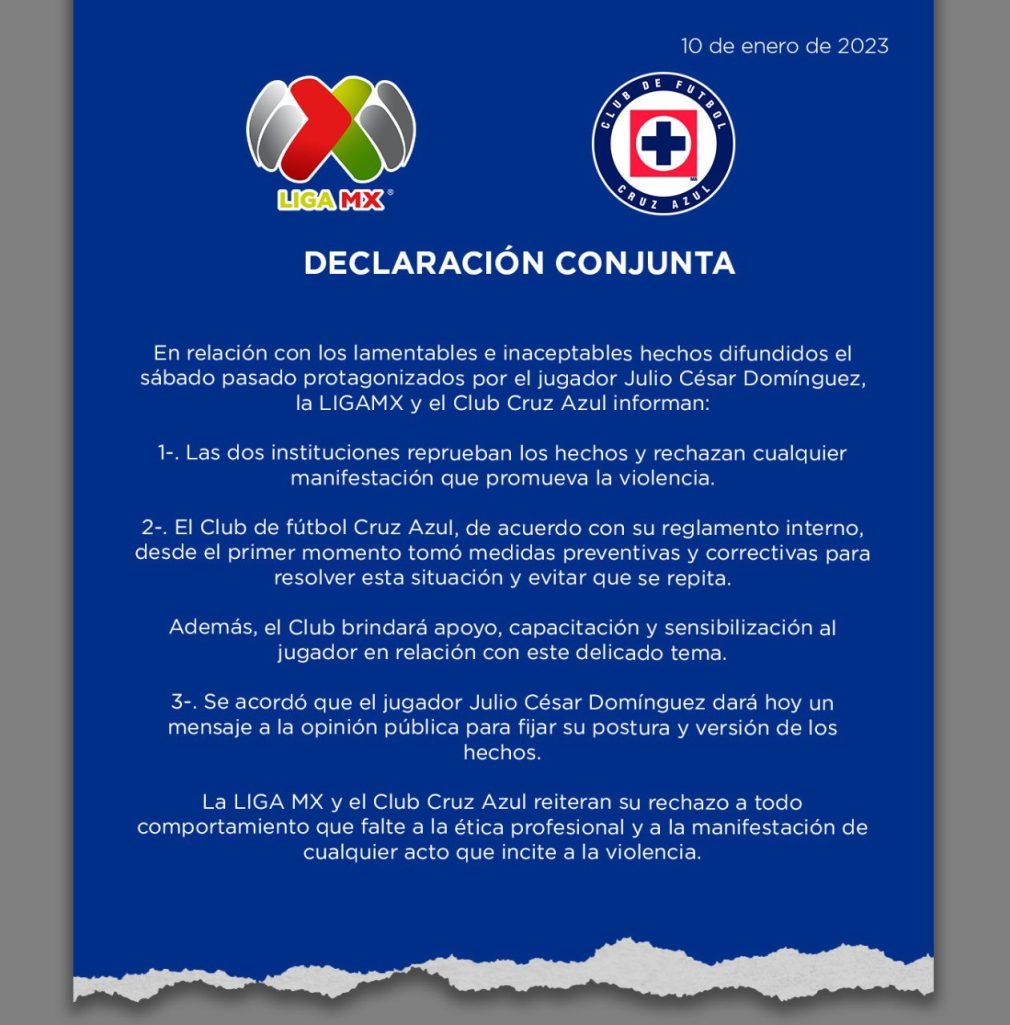 Asimismo, dieron a conocer que el zaguero mexicano Julio César Domínguez emitirá un mensaje a la opinión pública para fijar su postura y versión de los hechos.